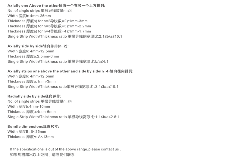 推薦扁線(xiàn)導體尺寸:厚度 1.00~3.00 mm; 寬度 5.00~18.00 mm;